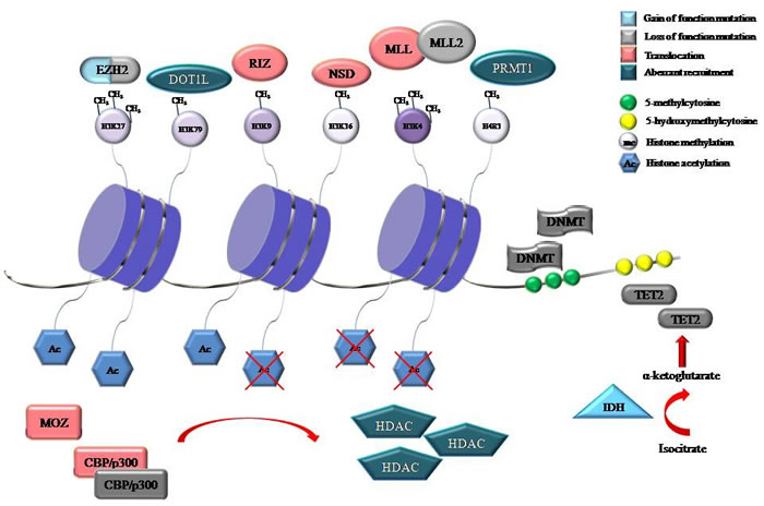 Figure 1: Representative proteins involved in DNA methylation and histone modifications that were identified to be recurrently mutated, translocated or aberrantly recruited in hematological malignancies. The consequences of mutations, either gain of function or loss of function are also shown. Gene symbol: CBP, cyclic AMP response element-binding protein; DNMT, DNA methyltransferase; DOT1L, disruptor of telomeric silencing 1-like; EZH2, enhancer of zeste 2; H3K4, histone 3 lysine 4; H3K9, histone 3 lysine 9; H3K27, histone 3 lysine 27; H3K36, histone 3 lysine 36; H3K79, histone 3 lysine 79; H4R3, histone 4 arginine 3; HDAC, histone deacetylase; IDH, isocitrate dehydrogenase; MLL, mixed-lineage leukemia; MOZ, monocytic leukemia zinc finger protein; NSD, nuclear-receptor-binding SET-domain-containing; PRMT, protein arginine N-methyltransferase; RIZ, retinoblastoma protein-interacting zinc finger; TET2, Ten-Eleven-Translocation 2.
