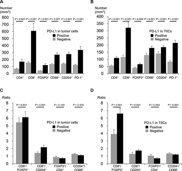 Figure 2: Associations between PD-L1 expression and tumor infiltrating immune cells. (A) Density of each immune cell type according to PD-L1 expression in TCs. (B) Density of each immune cell type according to PD-L1 expression in TIICs. (C) Immune cell ratios according to PD-L1 expression in TCs. (D) Immune cell ratios according to PD-L1 expression in TIICs.