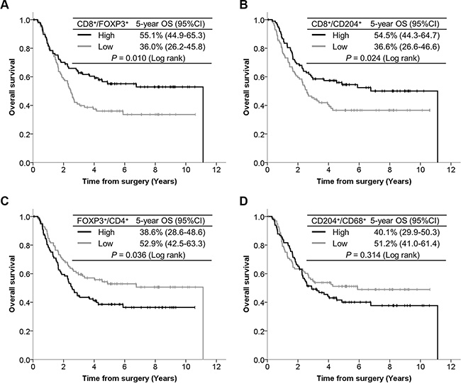 Figure 4: Kaplan-Meier curves according to TIIC ratios, with 5-year survival rate and the log-rank test for OS. (A) CD8+/FOXP3+ ratio. (B) CD8+/CD204+ ratio. (C) FOXP3+/CD4+ ratio. (D) CD204+/CD68+ ratio.