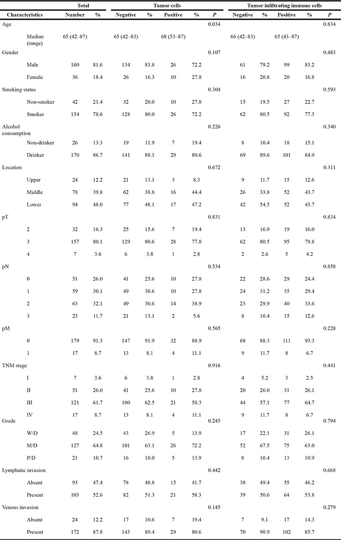 The clinicopathological characteristics of our patients are listed in Table 1. None of the patients in this study had distant organ metastasis or had received immune therapies, such as immune checkpoint inhibitors and immune cell therapy. Representative cases with PD- L1 expression in TCs and TIICs are shown in Figure 1. PD-L1 expression was positive in TCs from 36 patients (18.4%, 95% confidence interval [CI]: 13.2– 24.5). PD- L1 expression was positive in TIICs from 119 patients (60.7%, 95% CI: 53.5–67.6). Among patients showing PD-L1 positive in TCs, 83.3% demonstrated PD-L1 positive in TIICs, a significantly higher percentage than that in patients whose TCs were PD-L1 negative (P < 0.001) (Table 2). In total, 125 patients (63.8%, 95% CI: 56.6–67.6) had TC and/or TIIC positive for PD-L1. The only clinicopathological characteristic significantly associated with PD-L1 expression status, specifically that in TCs, was age (Table 1).