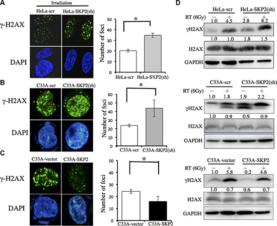 Figure 3: SKP2 increased DNA damages clearance upon ionizing radiation in human cervical cancer cell lines. C33A-scr, C33A-SKP2(sh), C33A-vector, C33A-SKP2, HeLa-scr and HeLa-SKP2(sh) cells were treated with 6-Gy irradiation. After 4 hours incubated, immunofluorescence staining for γ-H2AX (green) and DNA counterstaining with DAPI (blue). Number of γ-H2AX was counted. Western blots were done to determine the level of γ-H2AX and H2AX. GAPDH was used as the protein-loading control. (A) More γ-H2AX foci were found in HeLa-SKP2(sh) than HeLa-scr cells, after irradiation. The results of western blotting showed greater expression in HeLa-SKP2(sh) than HeLa-scr cells following irradiation. (B) More γ-H2AX foci were found in C33A-SKP2(sh) than C33A-scr cells, after irradiation. The results of western blotting showed greater expression in C33A-SKP2(sh) than C33A-scr cells following irradiation. (C) More γ-H2AX foci were found in C33A-vector than C33A-SKP2 cells, after irradiation. (D) The results of western blotting showed, greater expression of γ-H2AX in HeLa-SKP2(sh), C33A-SKP2(sh) and C33A-vector cells than HeLa-scr, C33A-scr and C33A-SKP2 cells following irradiation, respectively. Lower expression SKP2 of cells associated higher expression of γ-H2AX after irradiation. (*P <0.001).