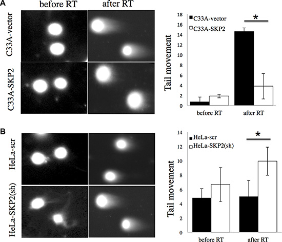 Figure 4: SKP2 enhances the responses of cervical cancer cells to DNA damage after irradiation. Alkaline comet assay was performed to assess DNA damages after irradiation treatment (RT) 2 hours in (A) C33A-vector/ C33A-SKP2 and (B) HeLa-scr / HeLa-SKP2(sh) stable clone cells. The assay was done in cells without irradiation (no RT) as control. Differences of tail movement before and after irradiation 2-hour were compared in (C33A-vector and C33A-SKP2) and (HeLa-scr and HeLa-SKP2(sh)). (*P < 0.001).