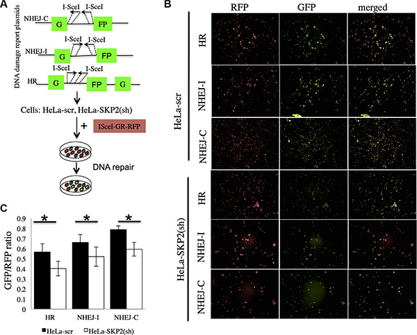 Figure 5: SKP2 increased the efficiency of NHEJ and HR repair of DSBs. (A) The reporter plasmids of NHEJ-I, NHEJ-C and HR were used to generate the reporter cell lines with stable expression of the reporter. (B) The cells were transfected with the RFP–ISceI–GR showed RFP-positive signal. ISceI cut the reporter plasmid ISceI-sites and created DSBs of DNA. Cells that successfully repaired the DSBs showed GFP-positive signal. (C) The ration of GFP+/RFP+ presented the efficiency of DSBs repair with HR or NHEJ. HeLa-SKP2(sh) showed significantly lower efficiency of DSBs repair (both HR and NHEJ) than HeLa-scr. (*P < 0.005).