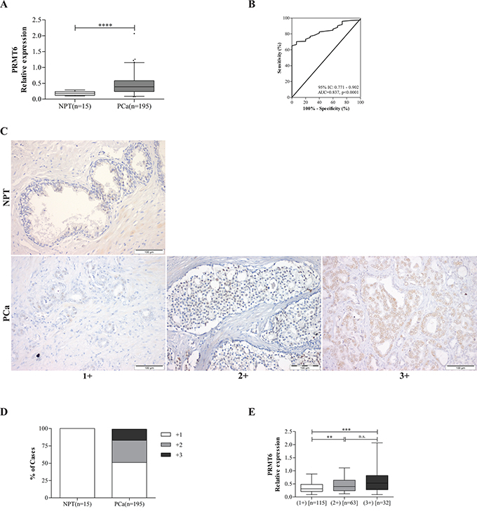 Figure 1: PRMT6 relative expression levels in prostate tissues. A. PRMT6 is overexpressed in PCa compared to NPTs; B. Performance of PRMT6 mRNA expression as a biomarker for PCa. ROC curve evaluating the ability of PRMT6 expression levels in discriminating PCa from normal prostate tissues; C. Illustrative images of PRMT6 immunostaining in NPT and PCa samples; D. Distribution of PRMT6 immunoexpression and of E. PRMT6 transcript levels in a series of prostate tissue samples (NPT and PCa), grouped according to PRMT6 immunostaining. ****p<0.0001 (Mann-Whitney U-test); (AUC, area under curve; CI, confidence interval).