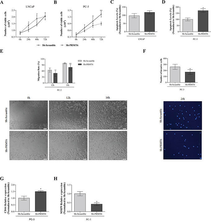 Cell viability was evaluated at days 0, 1, 2, and 3. In Sh-PRMT6 LNCaP, increased cell viability at 24h and 48h was observed. However, at 72h, cell viability was similar to Sh-Scramble (Figure 3A). Concerning PC-3, a significant decrease in cell viability was observed after PRMT6 knockdown, at 48h and 72h (Figure 3B). PRMT6 knockdown increased apoptosis, both in LNCaP and PC-3, but only reached statistical significance in the latter (Figure 3C and 3D). A significant decrease in migration ability was observed in Sh-PRMT6 PC-3 (Figure 3E) as well as a decrease in invasion capacity, although it did not reach statistical significance (Figure 3F). These results were confirmed at molecular level, as a significant decrease in MMP9 and an increase in CD44 expression was depicted upon PRMT6 silencing (Figure 3G).