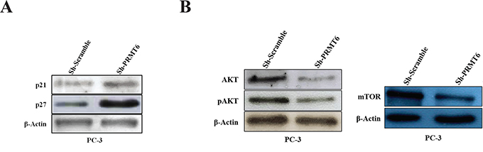 Figure 5: Western blot analysis of A. p21 and p27 expression in PC-3 cell line after PRMT6 knockdown; B. AKT, pAKT and mTOR expression in PC-3 cell line after PRMT6 knockdown.
