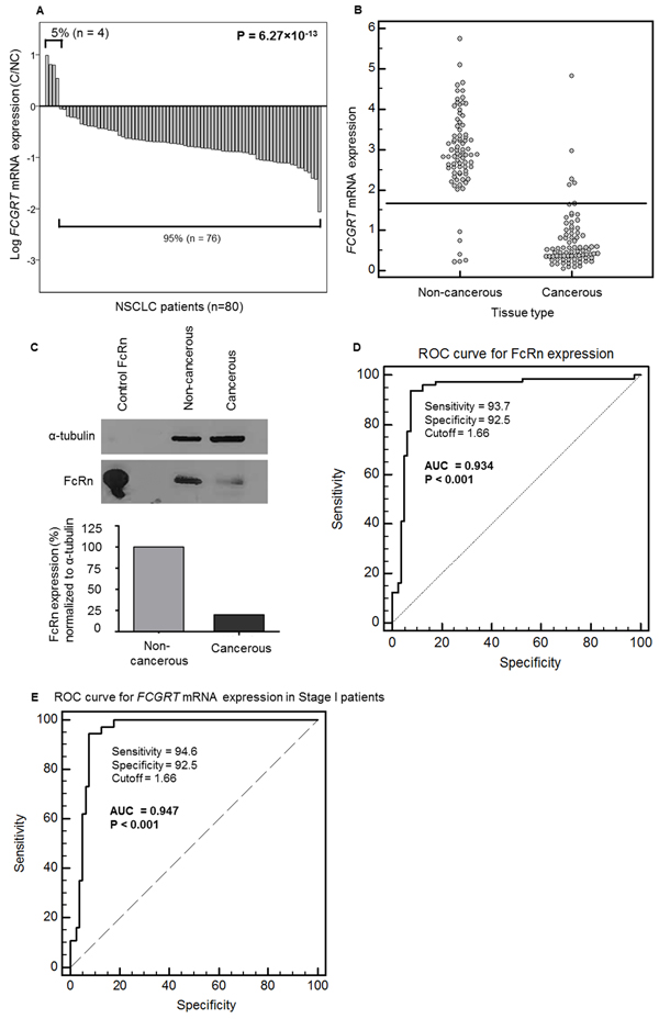 Figure 1: A. Ratios of FCGRT mRNA in cancerous (C) / non-cancerous (NC) in paired tissues from the NSCLC patients (n=80; P = 6. 27×10-13, Wilcoxon Signed Ranks test). B. Distribution of FCGRT mRNA levels in non-cancerous and cancerous tissues (n=80; P = 2.54×10-21, Mann-Whitney test). C. Representative image of FcRn protein revealed by western blotting in a pool of 10 patients with matched cancerous and adjacent non-cancerous tissue. Recombinant human FcRn protein was loaded as a positive control. Signals were quantified with ImageJ and normalized to that for α-tubulin. D. ROC curve analysis for FCGRT mRNA level in cancerous and non-cancerous lung tissue samples. n= 80, AUC = 0.934, SE = 0.024, 95% CI = 0.884 – 0.967, P < 0.0001, calculations according to DeLong et al., 1988. Youden index J = 0.863 (95% CI = 0.775 – 0.925, BCa bootstrap interval, 1000 iterations). E. ROC curve analysis for FCGRT mRNA levels in stage I cancerous and in non-cancerous tissues (n=37; AUC = 0.947, 95% CI = 0.905 – 0.989, P < 0.001, calculations according to DeLong et al., 1988. Youden index J = 0.871 (95% CI = 0.771 – 0.938, BCa bootstrap interval, 1000 iterations).