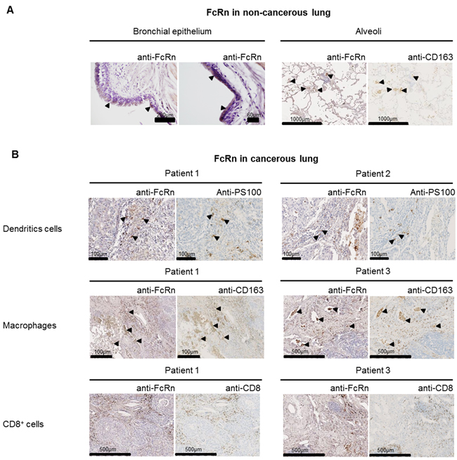 Figure 2: Expression of FcRn in non-cancerous A. and cancerous B. serial lung sections from a small set of patients (n=8). (A) FcRn expression was very week in bronchial epithelial cells (left panel) and marked in alveolar macrophages (right panel) in the non-cancerous lung. (B) In cancerous tissue, the staining revealed that FcRn is expressed in interstitial stromal cells including DCs (PS100), macrophages (CD163) (arrowheads indicate areas of colocalization) but no CD8+ T cells (CD8). A very weak staining was also observed in carcinomatous cells. Pictures from 3 patients were selected as they are representative of the different staining.