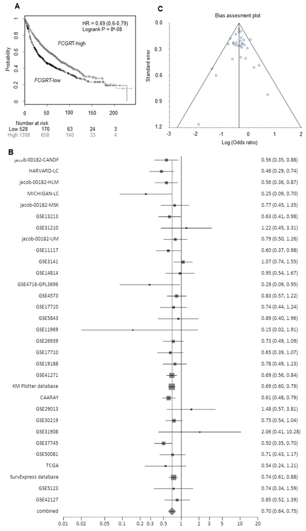 Meta-analysis on FcRn prognostic significance was performed by gathering all available Hazard Ratios and 95% Confidence Intervals for FcRn in lung cancer from different individual microarray-based studies using the publicly available biomarker analysis and validation tools: Prognoscan [25], ProgGene V2 [26], SurvExpress [27] and KM Plotter [24]. Subsequently we analyzed this information with the StatsDirect v3.0 [StatsDirect Ltd. StatsDirect statistical software. 2http://www.statsdirect.com. England: StatsDirect Ltd. 2013]. Statistical software in order to calculate the pooled Hazard Ratio, Cochran Q and I2 values, as well as and to produce Forest plots and Bias-assessment plots.