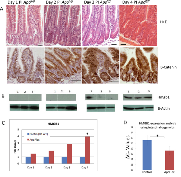 Figure 1: Accumulation of intestinal Hmgb1 following the loss of Apc. A. H+E stained intestine and β-catenin IHC following the conditional loss of Apc. Days post induction are indicated at the top. Elevated nuclear accumulation of β-catenin occurs from day 3 PI onward. B. Western Blot analysis of HMGB1 levels on triplicate epithelia cell extracts from each time point. Elevation of HMGB1 was first seen at day 3 PI. C. qRT-PCR of Hmbg1 expression levels presented as relative fold change within epithelia cell extracts compared to day 1 WT demonstrates a significant (*) induction 4 days PI (determined using Whitney U test of ΔCT values at P < 0.05). D. qRT-PCR of Hmbg1 expression levels presented as ΔCT values from control (wildtype) and Apc deficient intestinal organoid cultures. The values shown represent a 1.9 fold over-expression of Hmgb1 in the Apc deficient organoids.
