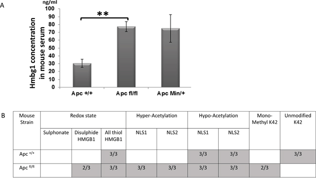 Figure 2: Elevation of serum HMGB1 following the loss of Apc. A. ELISA analysis demonstrating significant elevation of HMGB1 serum levels in Apcflox mice and increased levels in ApcMin mice compared to aged match mice. B. Table showing the number of samples in which the different post-translational forms of HMGB1 were detected in the serum of Apcflox mice day 4 PI, using MS/MS analysis. Empty boxes indicate this form was not detected in any of the samples analysed (n=3).