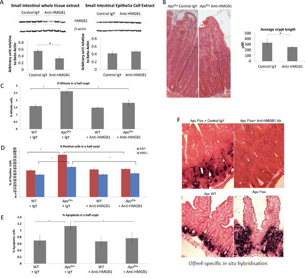 Figure 3: Characterisation of Wnt activated intestine following neutralising HMGB1-antibody treatment. A. Western blot analysis for total HMGB1 levels in the whole intestine and epithelial cell extracts. Densitometry analysis shows a significant (40%) reduction of HMGB1 protein level in the small intestine tissue, but no change in the epithelia cell extracts small intestine epithelial cells. B. The length from the base of a crypt to the top of the aberrant morphology displaying crypt-like features was significantly shorter following the treatment with neutralising HMGB1-antibody. C. Percent of mitotic bodies within the “floxed” region, D. percent of BRDU and Ki67 positive cells within the “floxed” region, and E. percent of apoptotic bodies within the “floxed” region are all significantly reduced following neutralising HMGB1-antibody treatment. F. Olfm4 In situ Hybridisation shows a marked reduction within the “floxed” region in Apcflox mice following neutralising HMGB1-antibody treatment. In all cases * denotes p<0.05, M-W U test.
