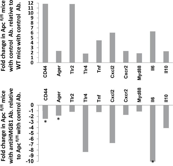 Figure 4: Expression analysis of inflammatory response genes in Wnt activated intestine following neutralising HMGB1-antibody treatment. Relative fold-change of a panel of inflammatory response genes in whole intestinal extracts following the loss of Apc compared to control (top panel) and in Apcflox mice following neutralising HMGB1-antibody treatment compared to control IgY treatment. * denotes significance determined using Whitney U test of ΔCT values at P < 0.05.