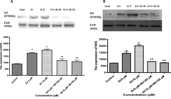 Figure 1: Simvastatin induces Nrf2 expression in HCT116 and HT-29 cells. A. HCT116 cells were incubated with the indicated concentrations of simvastatin for 24 h. Nrf2 expression was determined using Western blotting. Simvastatin increases expression of Nrf2 in a dose-dependent manner (*p < 0.001 compared with control), which is reversed by mevalonate treatment (**p < 0.001 compared with simvastatin alone). SV, simvastatin; MV, mevalonic acid. B. HT-29 cells were incubated with the indicated concentrations of simvastatin for 24 h. Nrf2 expression was determined using Western blotting. The data represent three independent experiments. Simvastatin increases expression of Nrf2 in a dose-dependent manner (*p < 0.001 compared with control), which is reversed by mevalonate treatment (**p < 0.001 compared with simvastatin alone). SV, simvastatin; MV, mevalonic acid.
