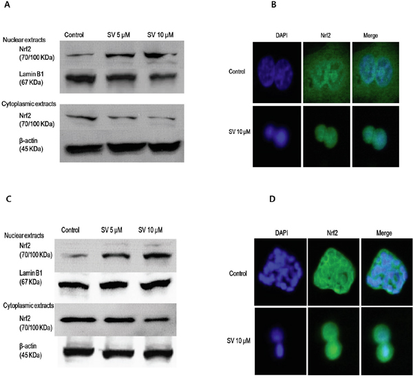 Figure 2: Effect of simvastatin on nuclear translocation of Nrf2. A. HCT116 cells were treated with 5 μM and 10 μM of simvastatin for 24 h. Nuclear fractions and cytoplasmic fractions were respectively analyzed by Western blotting for the detection of Nrf2 nuclear translocation Simvastatin increases the nuclear accumulation of Nrf2 in a dose-dependent manner. B. HCT116 cells were treated with 10 μM simvastatin for 24 h. After treatment, cell was fixed and labeled with an anti-Nrf2 antibody, followed by a fluorescein isothiocyanate (FITC)-conjugated secondary antibody. The nuclei were visualized by DAPI staining. Simvastatin for 24 h increased the nuclear accumulation of Nrf2 protein from the cytoplasm to the nucleus by immunocytochemical analysis. C. HT-29 cells were treated with the indicated concentrations of simvastatin for 24 h. Nuclear fractions and cytoplasmic fractions were respectively analyzed by Western blotting for the detection of Nrf2 nuclear translocation. Simvastatin increased the nuclear accumulation of Nrf2 in a dose-dependent manner. D. HT-29 cells were treated with 10 μM simvastatin for 24 h. After treatment, cells were fixed and labeled with an anti-Nrf2 antibody, followed by an FITC-conjugated secondary antibody. The nuclei were visualized by DAPI staining. Simvastatin for 24 h increased the nuclear accumulation of Nrf2 protein from the cytoplasm to the nucleus by immunocytochemical analysis. The data represent three independent experiments. SV, simvastatin.