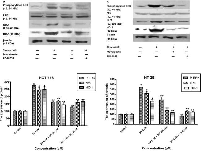 Taken together, we demonstrated that simvastatin activates Nrf2 activation and nuclear translocation of Nrf2 and then induces the expression of HO-1 related antioxidants via ERK and PI3K/Akt pathway in HT-29 cells. Further studies are needed to explore what the exact role of Nrf2 and HO-1 related antioxidants stimulated by simvastatin is while simvastatin suppresses cell proliferation and increases apoptosis in colon cancer cells.