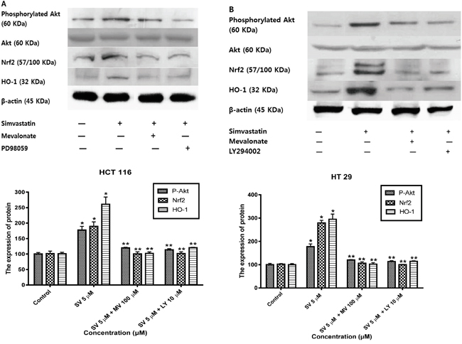 We had demonstrated that simvastatin inhibited HT-29 cell proliferation and induced apoptosis through the caspase cascade and affecting the expression of the Bcl-2 family proteins in our previous study (in press). The results of our present study demonstrated that simvastatin-induced HO-1 expression by nuclear translocation of Nrf2 via both ERK and PI3K/Akt pathway in HCT116 and HT-29 colon cancer cells.