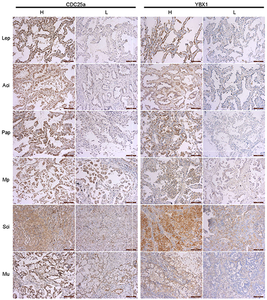 Figure 1: Immunohistochemical analyses of CDC25a and YBX1 proteins in different subtypes of lung adenocarcinoma. The expression of CDC25a and YBX1 in MIA was detected by IHC assay. MIA, minimally invasive adenocarcinoma; Lep, lepidic predominant adenocarcinoma; Aci, acinar predominant adenocarcinoma; Pap, papillary predominant adenocarcinoma; Mp, micropapillary predominant adenocarcinoma; Sci, solid predominant adenocarcinoma; Mu, mucinous predominant adenocarcinoma.100X magnification of the micrographs as insert in the figure.