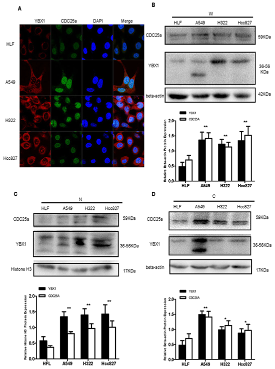 Figure 2: CDC25a and YBX1 were highly expressed in lung adenocarcinoma cell lines. A. Co-localization of CDC25a and YBX1 in HLF, A549, H322 and Hcc827 cells by IF assay. Red: YBX1; Green: CDC25a. B,C,D. The expression of CDC25a and YBX1 proteins in total (W), nuclear (N) and cytoplasm (C) protein in lung adenocarcinoma cell lines and HLF cells detected by Western Blot. Expression of CDC25a and YBX1 were calculated relative to the Beta-actin or Histone H3 expression. The quantification of YBX1 and CDC25a was originated from all bands shown in the photograph. The date was repeated three times and presented as the mean±SD (*p<0.05, **p=<0.001 and # p>0.005).