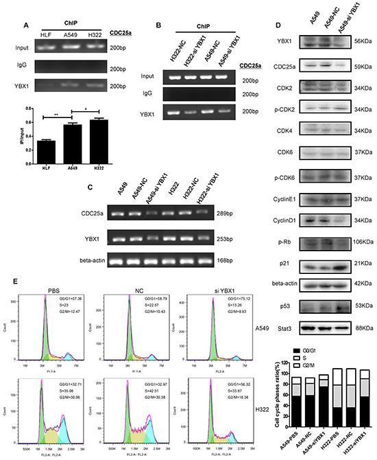 Figure 5: YBX1 knockdown inhibited the expression of CDC25a and changed its downstream in G1/S checkpoint pathway. A. In accordance with luciferase activity, the ChIP assays were performed in HLF, A549 and H322 cells to confirm the endogenous of YBX1 binding to the CDC25a promoter (-352 to -153 bp) using an anti-YB-1 antibodyor normal rabbit IgG. B. YBX1 knockdown reduced endogenous YBX1 binding to the CDC25a promoter using ChIP assays in A549 and H322 cells. C. RT-PCR assay revealed si-YBX1 inhibited the mRNA expression of YBX1 and CDC25a in A549 and H322 cells. D. G1/S checkpoint pathway was detected by Western blot assay in A549 cells transfected with si-YBX1. E. Thesi-YBX1-transfected A549 and H322 cells stagnated in G0/G1 phase by cell cycle analysis.