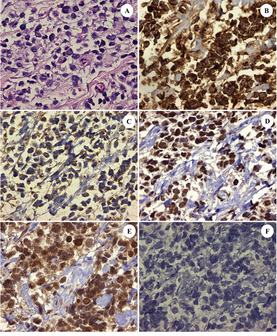 Figure 1: The patient's ARMS, PAX3-FKHR subtype with: H&E stained section showing dedifferentiated tumor cells A. high expression of insulin-like growth factor (IGF)-1 receptor [Tyr1165/1166] in the cytoplasm of the tumor cells B. activation of c-Met tyrosine kinase as evidenced by the moderate expression in the cytoplasm of phosphorylated (p)-c-Met (Tyr1234/1235) at up to 2+ C. constitutive activation of the mTORC2/Akt pathway with concomitant nuclear expression of p-mTOR (Ser 2448) and p-Akt (Ser473) consistent with mTORC2 pathway activation D. and E. and downstream signaling from IGF-1R. Contrast with negative control F. (DAB[3,3'-diaminobenzidine] brown chromogenic signal; original magnifications x400 for Frames A-F).