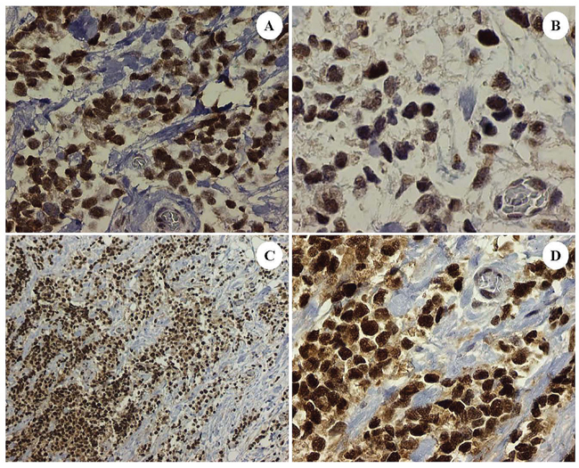 Figure 2: Dedifferentiated tumor cells in the patient's ARMS, PAX3-FKHR subtype showing correlative expression in tumoral nuclei of: Sirt1 A. Gli2 B. and EZH2 C. and D. DAB brown chromogenic signal, original magnifications x400 for Frames A, B and D and x100 for Frame C).