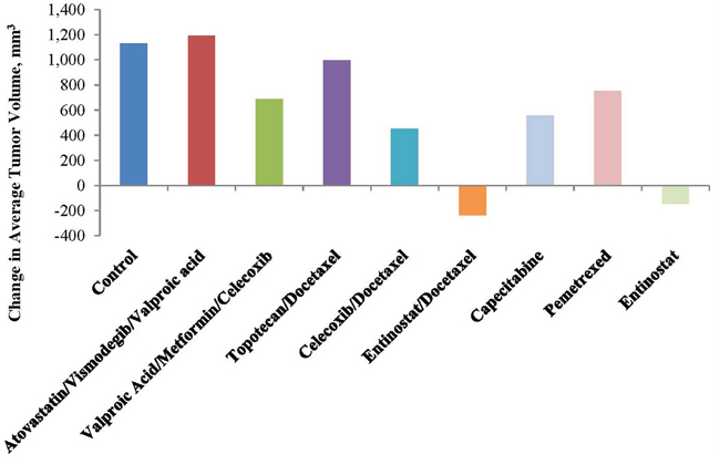 Figure 3: Relative growth of treatment groups at test completion. Note tumor regression with entinostat and tumor growth inhibition with valproic acid, a class I histone deacetylase inhibitor, celecoxib and metformin.