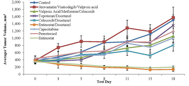 Figure 4: Tumor volume and agent activity data plotted against test days 0 to 18. Note tumor regression over time with entinostat and tumor growth inhibition over time with valproic acid, a class I histone deacetylase inhibitor, celecoxib and metformin vis-à-vis the control.