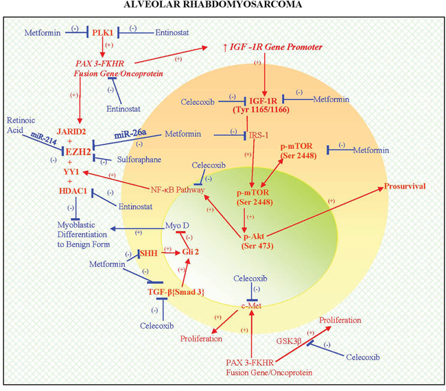 Alveolar rhabdomyosarcoma (ARMS) is a highly aggressive soft tissue sarcoma affecting children and adolescent age groups. At the genomic level it can be associated with translocations involving t(2;13) or t(1;13) resulting in fusion transcripts of PAX3-FKHR (FOXO1) and PAX7-FKHR (FOXO1) genes and corresponding proteins, reportedly accounting for 55% and 22% of ARMS, respectively in one study [1]. Moreover, in this same study the PAX3-FKHR group demonstrated an estimated 4-year overall survival of only 8% and with metastatic disease, a significant increased risk of failure and death. The biology of ARMS has recently been summarized to include blocks in differentiation and promotion of proliferation in the context of genomic aberrations and specifically, has incorporated the insulin-like growth factor (IGF), c-Met, GSK3-β, transforming growth factor (TGF)-beta/Gli2, YY1, and enhancer of Zeste homolog 2 (EZH2) pathways [2–17]. In short, by neutralizing the biological influence of the fusion transcript and protein, PAX3-FKHR (FOXO1) and targeting the pathways that impose both a block in differentiation and facilitate proliferation, we should be able to convert this aggressive and lethal form of ARMS to a more benign and indolent state and prevent recurrent disease.