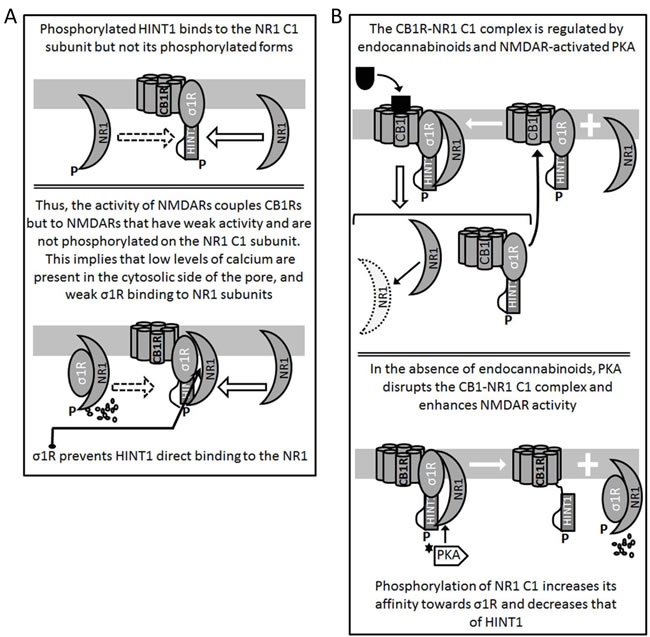 Figure 2: Diagram showing the relationship between HINT1 proteins and σ1Rs in their association with the NMDAR NR1 C1 subunits and CB1Rs. A. Binding of HINT1 and σ1R to NR1 subunits and CB1Rs. Their interaction is unidirectional and while HINT1 does not dampen σ1R binding to CB1R or NR1 subunits, the σ1R dissociates HINT1 from the NR1 and weakens its interaction with the CB1R. B. CB1Rs bind to the NMDAR NR1 subunits via HINT1 proteins. The binding of RGS-Rz proteins to HINT1 prevents the formation of the CB1R-NMDAR complex and, NMDAR-activated CaMKII removes this barrier to make their coupling and cross-regulation possible.