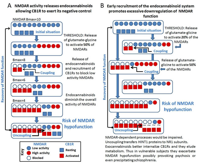 Figure 5: Cross-regulation between excitatory glutamate NMDAR signaling and the endocannabinoid system: Implications in psychosis and schizophrenia. A. The activity of NMDARs demands endocannabinoid control via CB1Rs. B. Disproportionate endocannabinoid control could cause NMDAR hypofunction.