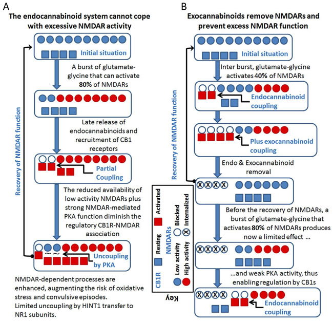 Figure 6: Cannabinoids can prevent the overactivation of glutamate NMDARs and reduce the incidence of convulsive episodes. A. If the endocannabinoid system fails to control excess NMDAR activation, PKA activity increases disrupting CB1R-NMDAR complexes before they can be acted on by endocannabinoids. B. Exocannabinoids acting through NMDAR-recruited CB1Rs would reduce glutamate excitatory signaling. The exocannabinoids acting on the preformed CB1R-NMDAR complexes prevent PKA from disrupting these complexes (indicated as “plus exocannabinoid coupling”).