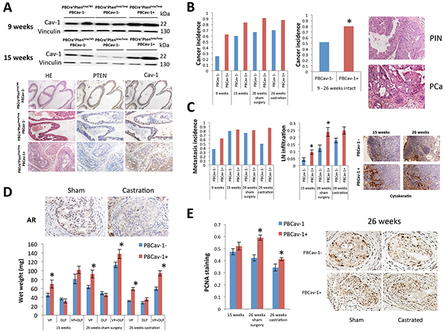 Figure 1: Cav-1 overexpression induced PCa development, enhanced growth, and promoted hormone resistance in PTENcKO tumors. A. Cav-1 expression in the VPs of 9- and 15–week-old PBCre+;Ptenloxp/WT;PBCav-1-, PBCre+;Ptenloxp/loxp;PBCav-1- (PBCav-1-), and PBCre+;Ptenloxp/loxp;PBCav-1+ (PBCav-1+) mice. PBCav-1+ mice had higher expression of Cav-1 in their ventral prostates at 9 (P=0.035) and 15 weeks (P=0.001) of age. Representative PTEN and Cav-1 staining in the VPs of 9-week-old mice. B. Incidence of invasive PCa in PBCav-1- (blue columns) and PBCav-1+ (red columns) mice. PBCav-1+ mice had a higher incidence of invasive cancer at 9–26 weeks (P=0.036). C. Incidence of lymph node metastasis in PBCav-1- (blue columns) and PBCav-1+ (red columns) mice. No statistically significant difference was found. However, LN infiltration (percentage of cytokeratin+ metastatic PCa cells) was found to be significantly higher in PBCav-1+ than in PBCav-1- mice at 15 (P=0.03) and 26 weeks (P=0.01). D. Wet weights of VP, DLP, and VP and DLP combined in PBCav-1- and PBCav-1+ mice at 15 weeks and 26 weeks, 10 weeks after sham surgery or castration. PBCav-1+ mice had significantly heavier VPs at 15 weeks (P=0.048) and 26 weeks after sham surgery (P=0.002) and after castration (P<0.0001) and heavier VPs and DLPs combined at 26 weeks after sham surgery (P=0.043) and castration (P=0.00034). Representative images from AR staining after sham surgery and after castration show that AR nuclear localization was significantly reduced 10 weeks after castration compared to sham surgery E. PCNA staining of cells from PBCav-1- and PBCav-1+ mice at 15 weeks and 26 weeks after sham surgery or castration. PBCav-1+ mice had a higher percentage of PCNA+ cells in their VPs at 26 weeks after sham surgery (P=0.0013) and castration (P=0.025).