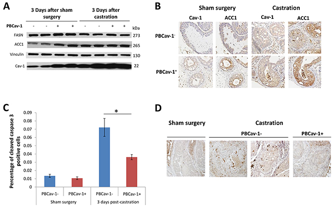 Figure 3: PBCav-1+ mice expressed higher ACC1 and FASN levels, and castration increased Cav-1 and ACC1 expression in PTENcKO tumors. A. 3 days after sham surgery, PBCav-1+ mice had higher expression of FASN (P=0.011) and ACC1 (P=0.002) than did PBCav-1- mice. Mice that had undergone castration had higher expression of Cav-1 than did mice that had undergone sham surgery (P=0.014 for PBCav-1- mice and P=0.035 for PBCav-1+ mice). In addition, after castration, PBCav-1- mice had higher protein expression of ACC1 than did PBCav-1- mice after sham surgery (P=0.011). B. Cav-1 and ACC1 staining intensity was found to be significantly higher in animals who had undergone castration than in those who had undergone sham surgery (P=0.017 for Cav-1 and P=0.0077 for ACC1). The staining intensities of Cav-1 and ACC1 were found to be correlated in the examined tumors by Spearman correlation (P<0.025). C. PBCav-1+ mice had a significantly lower percentage of cleaved caspase 3+ cancer cells (P=0.025) 3 days after castration. D. Representative slides from the VPs of PBCav-1- and PBCav-1+ mice 3 days after sham surgery or castration showing cleaved caspase 3 staining.
