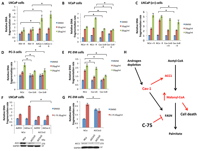 Figure 5: Cav-1 expression increased the sensitivity of PCa cells to the FASN inhibitor C-75, leading to cell death through malonyl-CoA accumulation. A. Cav-1 induction increased the apoptotic effect of C-75 in LNCaP cells in the presence (P=0.021 for 10 μg/ml and P=0.004 for 20 μg/ml) and absence of R1881 (P=0.008 for 20 μg/ml). B. Cav-1 downregulation reduced the apoptotic effect of C-75 in VCaP cells in the presence (P=0.0066 for 10 μg/ml and P=0.0054 for 20 μg/ml) and absence of R1881 (P<0.0001 for 10 μg/ml and P=0.026 for 20 μg/ml). C. Cav-1 downregulation reduced the apoptotic effect of C-75 in LNCaP (c+) only in the absence of R1881 (P=0.00014 for 10 μg/ml and P=0.036 for 20 μg/ml). D. Cav-1 downregulation reduced the apoptotic effect of C-75 at 10 μg/ml using Cav-1siRNA6 (P=0.018) and at 20 μg/ml using Cav-1siRNA6 and Cav-1siRNA8 (P=0.007 and P=0.02, respectively) in PC-3 cells. E. Cav-1 downregulation reduced the apoptotic effect of C-75 at 10 μg/ml (P=0.001 for Cav-1siRNA6 and P<0.001 for Cav-1siRNA8) and at 20 μg/ml (P<0.001 for Cav-1siRNA8) in PC-3M cells. F. LNCaP cells that had been pretreated with ACC1siRNA2 were less sensitive to C-75 (P<0.001) than were cells treated with NCsi. G. PC-3M cells that had been pretreated with ACC1siRNA2 were less sensitive to C-75 (P=0.014) than were cells treated with NCsi. H. Cav-1, which is induced in androgen-depleted conditions, promoted ACC1 and FASN expression. FASN inhibition by C-75 in the setting of Cav-1 upregulation led to the accumulation of the intermediate product of ACC1, malonyl-CoA, which is cell toxic proportionally to its accumulation.