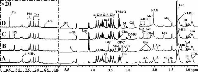 Figure 1: Average 1H NMR spectra of plasma samples from different pathological backgrounds. (A) Healthy control; (B) TACE for recurrence or metastasis of HCC; (C) HCC only subject; (D) post-operative HCC subject. Keys for the assignments are shown in Table 2 and Table S1.