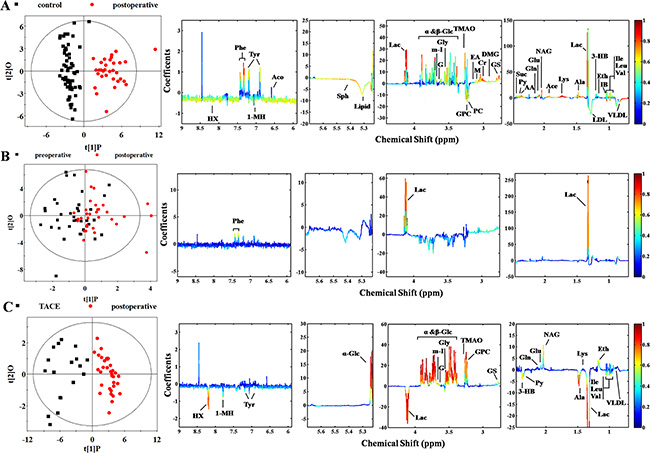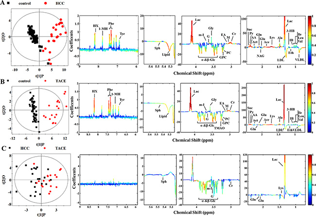Figure 2: Scores and loading plots for determination of plasma metabolites responsible for the metabolic variations in different pair-wise pathological subjects via OPLS-DA analyses. (A) Control versus HCC groups (R2X = 52.2%, R2Y = 0.836, Q2 = 0.798, P < 0.0001); (B) control versus TACE groups (R2X = 58.5%, R2Y = 0.880, Q2 = 0.849, P < 0.0001); (C) HCC versus TACE groups (R2X = 48.1%, R2Y = 0.381, Q2 = -0.041, P = 1).