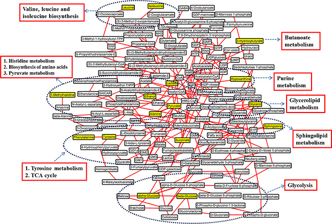 Principal component analysis (PCA) was performed on the plasma 1H NMR data from different pair-wise groups to reveal trends and show clusters among the subjects. The PCA scores plots revealed an obvious separation between control (n = 60) and HCC patients (n = 24, without surgery or treatment) (Figure S1A), which implied abnormal metabolic pattern from HCC patients. Orthogonal projection to latent structure with discriminant analysis (OPLS-DA) was subsequently utilized to identify differential metabolites responsible for metabolic differences (Figure 2A). The reliability of OPLS-DA models could be evaluated by Q2 value and significant level of P value. Usually larger Q2 value described better reliability. To determine statistical significance for these selected metabolites, relative concentrations were compared by Student’s t-test analysis. As a result, seven selected metabolites were considered not significant and excluded in the final list of characteristic metabolites (Table 1). Lower levels of glucose, glycerophosphocholine, LDL, lipid, sphingosine, and VLDL, together with higher levels of lactate, and certain amino acids such as alanine, lysine, and valine were observed in HCC group than that of control, revealing high consumption of glucose in HCC subjects. Our results share some characteristic metabolites with some similar studies [17, 19, 25], including acetate, ethanol, glucose, etc. Meanwhile, some novel characteristic metabolites in the present work, such as alanine, hypoxanthine, sphingosine, etc., were also identified. It is suggestive that some kinds of population-related metabolic alteration are associated with HCC state, but a series of biological behaviors caused by high glucose consumption have become a common feature.