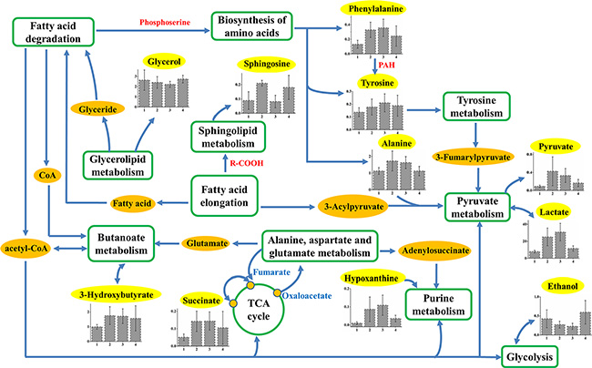 Recently, metabolomics has been proved to be a highly successful approach that is capable of detecting metabolic changes under different pathophysiological status [4]. By measuring changes in metabolite concentrations in the biological tissues or biofluids, the mutagenicity and progression of a disease can be determined and monitored [5, 6]. Metabolomics based on nuclear magnetic resonance (NMR) spectroscopy or mass spectroscopy could be used to identify biomarkers for specific pathological or physiological status. Metabolomic analysis of human tissues and biofluids has been increasingly used to unveil metabolic alterations associated with different cancer types, such as breast [7], kidney [8], lung [9], prostate [10], and colorectal cancers [11]. In the case of liver diseases, a number of studies have been focusing on the metabolic profiling of tissues or biofluids. Shariff et al. and Wu et al. respectively reported that a set of urinary metabolites (creatinine, carnitine, creatine, and acetone, etc) can be used to identify metabolic changes associated with HCC [12, 13] in Nigerian and Chinese populations. Apolito and colleagues performed tissue-based liquid chromatography-mass spectrometry to discriminate primary HCC from hepatic colorectal metastases via the changes of basic amino acids (arginine, citrulline, ornithine) [14]. Differential metabolites including alanine, leucine, and glucose have been identified to define hepatic tumorigenesis [15, 16]. Moreover, metabolic abnormalities have also been demonstrated by serum and plasma studies associated with the severity of liver disease. Fages et al. found sixteen metabolites in serum were significantly associated with HCC risk of a European prospective cohort [17]. Other studies show significant differences between compensated and decompensated cirrhosis, and between alcoholic cirrhosis and viral hepatitis [18–20]. The influence of hepatitis infection and potential liver damage were simultaneously assessed [21, 22]. To date, several NMR or mass spectrometry-based serum metabolomic studies have been conducted to study HCC [17, 19, 20, 23]. And discriminatory metabolic alterations in HCC patients could draw a basic conclusion that altered mitochondrial respiration and glycolytic pathways lead to altered metabolic profiles in tumor cells [24, 25], but the identified metabolites are not concordant across these studies. Hence, these identified metabolites need to be further validated, not only that, global metabolic evaluation need to be simultaneously explored and studied to see alterations in the clinical treatment response or in the prognoses associated with recurrence or metastasis of HCC.