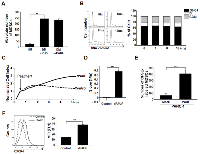 Figure 2: PAUF promotes MDSC migration into tumor tissues. A. BM cells isolated from C57BL/6 mice were cultured under MDSC-differentiating (GM-CSF- and IL-6-treated) or non-differentiating conditions with cells under differentiating conditions being grown with or without rPAUF (0.5 μg/ml) treatment. After 4-day culture, the absolute number of MDSCs was evaluated by flow cytometry. NM, non-differentiating medium; DM, differentiating medium. B. MDSCs treated with rPAUF were analyzed for cell cycle status by propidium iodide (PI) staining and flow cytometry at the indicated time points. The bar graph (right) shows cell cycle distribution percentages at each time point estimated from the DNA content analysis (left). Experiments were performed three times and representative images are shown. C. Real-time migration of MDSCs treated or untreated with rPAUF was monitored for 5.5 hours in vitro using the xCELLigence system. D. The slopes (1/hour) were calculated based on the cell index values shown in (C). E. In vivo MDSC migration was evaluated by subcutaneous injection of PANC-1/Mock or PANC-1/PAUF cells into both flanks of NOD/SCID mice (n = 5), followed by adoptive transfer of CFSE-labeled MDSCs isolated from EL4 tumor-bearing mice after two weeks of tumor challenge, and flow cytometric analysis of tumor-infiltrated MDSCs 24 hours after the adoptive transfer. F. CXCR4 expression on EL4 tumor-bearing mice-derived MDSCs treated or untreated with rPAUF for 16 hours was examined by flow cytometry. Data represent mean ± S.D. of three independent experiments, and representative images are shown. MFI, mean fluorescence intensity. **, p < 0.01; ***, p < 0.001.
