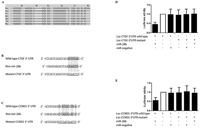 Figure 1: Sequence comparison between miR-26b and 3′UTR of CTGF and CCND1. A. The “seed sequence” in the 3′ UTR of the target gene of rno-miR-26b is highly conserved among the species including, but not limited to, Rno, Has, Ptr, Mml, Oga, Tbe, and Mmu; B. Schematic comparison between rno-miR-26b and the wild-type (upper sequence)/mutated (lower sequence) 3′UTR of CTGF with “seed sequence” highlighted; C. Schematic comparison between rno-miR-26b and the wild-type (upper sequence)/mutated (lower sequence) 3′UTR of CCND1 with “seed sequence” highlighted; D. The relative luciferase activity in the rPASMCs transfected with both wild-type 3′UTR of CTGF and rno-miR-26b is significantly lower than the controls (p<0.01); E. The relative luciferase activity in the rPASMCs transfected with both wild-type 3′UTR of CCND1 and rno-miR-26b is significantly lower than the controls (p<0.01). All experiments were repeated three times (N value=3).