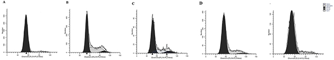 Figure 3: Effect of MCT, CTGF shRNA, CCND1 shRNA and miR-26b on the cell cycle status in rPASMCs. A. Flow cytometric determination of cell cycle status in rPASMCs harvested from the rats treated with normal saline; B. Flow cytometric determination of cell cycle status in rPASMCs harvested from the rats treated with monocrotaline+NCshRNA; C. Flow cytometric determination of cell cycle status in rPASMCs harvested from the rats treated with monocrotaline and CTGF shRNA; D. Flow cytometric determination of cell cycle status in rPASMCs harvested from the rats treated with monocrotaline and CCND1 shRNA; E. Flow cytometric determination of cell cycle status in rPASMCs harvested from the rats treated with monocrotaline and rno-miR-26b. All experiments were repeated three times with three independent animals for each treatment group (N value=3).