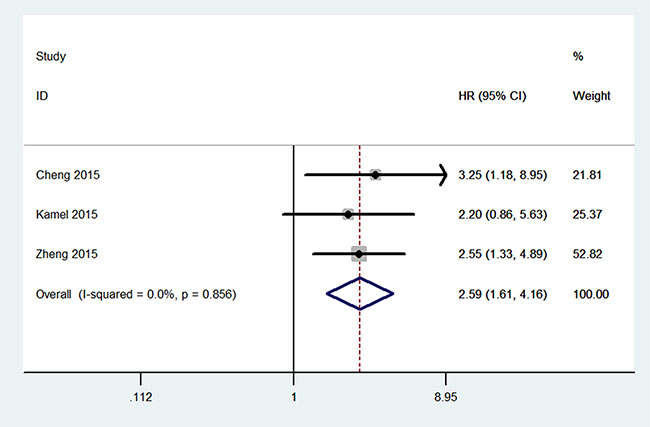 The association between UCA1 and PFS was investigated in 3 studies (Figure 3). There was a significant negative association between UCA1 levels and PFS (HR2.59, 95% CI1.61–4.16; Figure 3). All the results are listed in the Table 2.