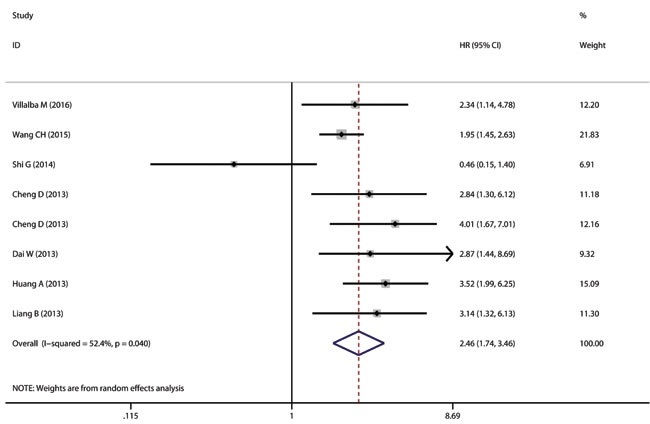 Figure 3: The correlation between TMPRSS4 expression and time to tumor progression (TTP) in solid tumor. TMPRSS4 overexpression in solid tumors is significantly associated with patients’ short TTP (pooled HR = 2.456, 95% CI = 1.744-3.458, P < 0.001).