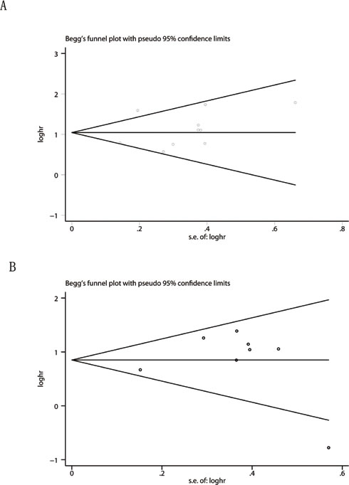 Figure 4: Begg’s funnel plots for the studies involved in the meta-analysis of TMPRSS4 expression and the prognosis of patients with solid tumors. A. Overall survival. B. Time to tumor progression. Abbreviations: loghr, logarithm of hazard ratios; s.e., standard error.
