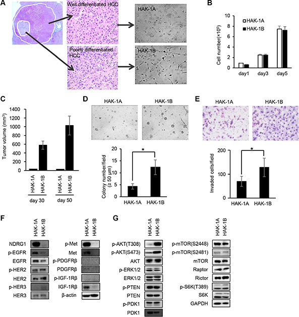 Figure 1: Comparison of the biological and biochemical characteristics of HAK-1A and HAK-1B cells. (A) Morphology of HCC cell lines in culture. HAK-1A shows cobblestone-like morphology, and HAK-1B shows a fibroblastic morphology when cultured in plastic dishes. A single HCC tumor showing a nodule-in-nodule appearance. The well differentiated HAK-1A and poorly differentiated HAK-1B cell lines were derived from the outer and inner nodules of the same tumor, respectively. (B, C) Comparison of cell proliferation rates in vitro (B), and tumor growth rates on days 30 and 50 in nude mice (C) engrafted with HAK-1A and HAK-1B cells (n = 3). Each bar is the average ± standard deviation (SD). (D) Comparison of colony formation under “Matrigel on top” culture conditions between HAK-1A and HAK-1B cells. Representative images of colonies of HAK-1A and HAK-1B cells incubated for 5 days (upper panel). The number of colonies > 50 μm (lower panel) (n = 3). Each bar is the average ± standard deviation (SD), *P < 0.05 (two-tailed Student t test). (original magnification ×40) (E) Comparison of invasion of Matrigel between HAK-1A and HAK-1B cells. Representative images of invaded cells incubated for 24 hr (upper panel), and the number of invaded cells (lower panel) (n = 3). Each bar is an average ± SD, *P < 0.05 (two-tailed Student t test). (original magnification ×40) (F) Comparison of expression levels of NDRG1 and growth factor receptors in HAK-1A and HAK-1B. β-actin served as loading control. (G) Comparison of the expression of downstream effectors in HAK-1A and HAK-1B cells. GAPDH served as loading control.
