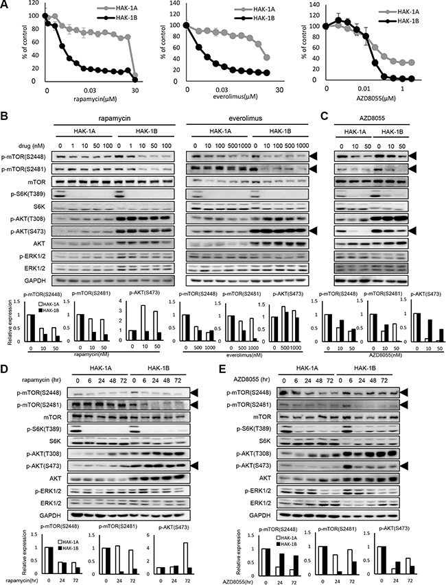 Figure 2: The effect of mTOR inhibitors on the activation of mTOR-related signaling molecules in HAK-1A and HAK-1B cells. (A) Sensitivity to mTOR inhibitors of HAK-1A and HAK-1B cells. Cells were exposed to various concentrations of the indicated drugs for 72 hr, and drug sensitivity was determined using a WST assay. Each value is the average ± SD of triplicate wells, and each percentage value was calculated by normalizing the raw data to that of the control without drugs (100%). (B) The effect of selective mTORC1 inhibitors on the expression and phosphorylation of mTOR and its related signaling molecules. Cells were treated with each inhibitor at the indicated concentrations for 6 hr, and lysates were analyzed using western blotting. The lower panel shows the quantification of expression levels of p-mTOR (Ser2448 and 2481) and p-AKT Ser473 normalized to the value in the absence of drugs. GAPDH served as loading control. (C) The effect of 6 hr treatment with AZD8055 on the expression and phosphorylation of mTOR and its related signaling molecules. The lower panel shows the relative expression levels of p-mTOR (Ser2448 and Ser2481) and p-AKT Ser473 normalized to the value in the absence of drugs. GAPDH served as loading control. (D) Kinetics of the effect of rapamycin (1 nM) on the expression and phosphorylation of mTOR and its related signaling molecules. In the lower panel, expression levels of p-mTOR (S2448 and S2481) and p-AKT Ser473 are presented as their values normalized to the value at time 0. GAPDH served as loading control. (E) Kinetics of the effect of AZD8055 (20 nM) on the expression and phosphorylation of mTOR and its related signaling molecules. In the lower panel, expression levels of p-mTOR (Ser2448 and Ser2481) and p-AKT Ser473 were normalized to the value at time 0. GAPDH served as loading control.