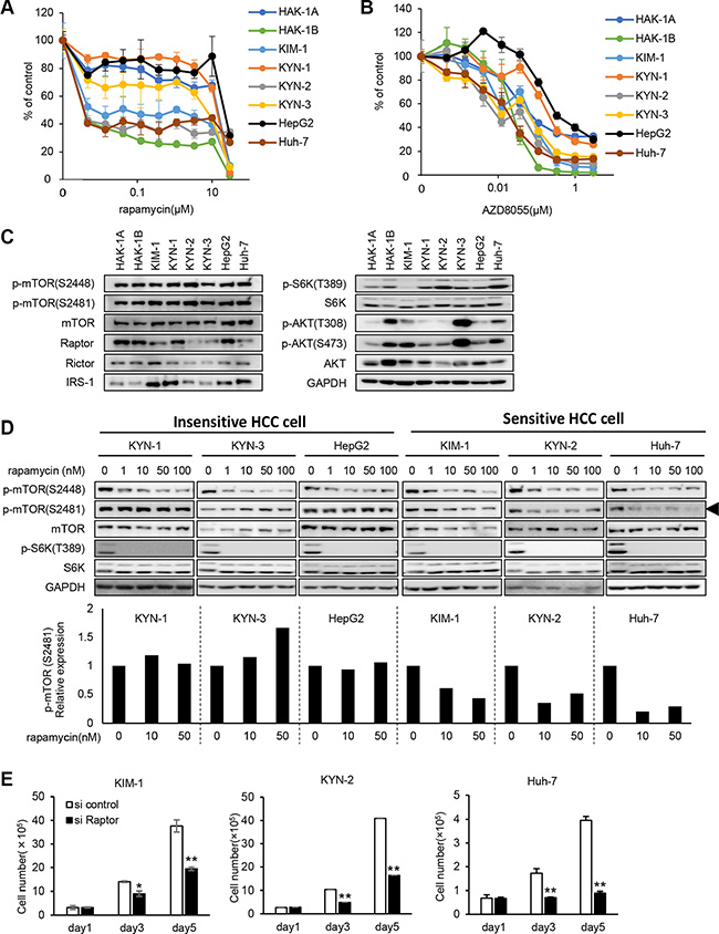 Figure 4: Hypersensitivity to rapamycin and mTORC1-addicted growth of other human HCC cell lines. (A, B) The sensitivities of eight human HCC cell lines to rapamycin (A) and AZD8055 (B) were assessed using a WST assay. Each bar is the average ± SD of triplicate wells. (C) Comparison of the expression and phosphorylation of mTOR and its related signaling molecules among eight human HCC cell lines, including HAK-1A and HAK-1B cells. GAPDH served as loading control. (D) The effect of rapamycin on the phosphorylation of mTOR and S6K in six cell lines. Cells were treated with rapamycin at indicated concentration for 6 hr, and lysates were analyzed using western blotting. In the lower panel, expression levels of p-mTOR (Ser2481) are normalized to the values in the absence of drugs. GAPDH served as loading control. (E) The effect of Raptor knockdown on cell growth. Cells were incubated with a Raptor-siRNA for < 5 days. Each bar is the average ± SD of triplicate wells, *P < 0.05; **P < 0.01 (two-tailed Student t test).