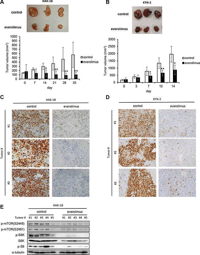Figure 5: Effect of everolimus on tumor growth and activation of mTOR-related signaling molecules in vivo. (A, B) Antitumor effects of everolimus on the growth of HAK-1B (A) and KYN-2 (B) xenografts. Mice were inoculated subcutaneously with HCC cells, and mice with tumors >100 mm3 were treated orally with everolimus (2 mg/kg/day) or a control CMC daily from day 0 until days 35 or 14 (n = 5 mice per each group). Each bar is the average ± SD, *P < 0.05; **P < 0.01 (two-tailed Student t test). (C, D) Effects of everolimus on S6 phosphorylation in tumors formed by HAK-1B (C) or KYN-2 (D) cells analyzed on days 35 or 14 using immunohistochemistry with an anti-p-S6 antibody. Three tumors of the control and treated groups are shown. (original magnification ×100) (E) Inhibitory effects of everolimus on the activation of mTOR-related signaling molecules in tumors. Western blot analysis of the expression of phosphorylated mTOR, S6K, and S6 in five tumors treated with or without everolimus in vivo. α-tubulin served as loading control.