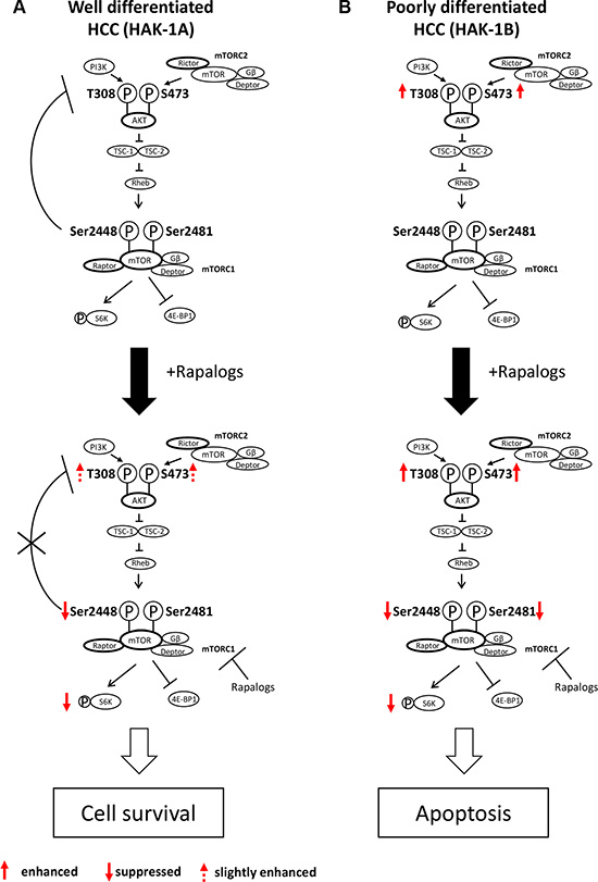 Figure 6: Hypothetical model of the acquisition of hypersensitivity to rapalogs by HCC cells. (A) Normally, PI3K/AKT activation is under feedback regulation by mTORC1/S6K, such as in well differentiated HCC cells (e.g. HAK-1A cells). Rapalogs inhibit feedback suppression by mTORC1/S6K, possibly through drug-induced inhibition of the phosphorylation of mTOR Ser2448, which is accompanied by PI3K/AKT activation. Rapalogs do not affect the phosphorylation mTOR Ser2481 (mTORC1 complex), and the cells survive in the presence of drugs. (B) In contrast, PI3K/AKT is constitutively activated in poorly differentiated HCC cells (e.g. HAK-1B cells), and feedback control of PI3K/AKT by mTORC1 is dysregulated in this cell line. Rapalogs block the phosphorylation of both mTORC1 Ser2448 and Ser2481 that induces the death of HAK-1B cells through suppression of mTORC1-dependent cell growth, survival, and metabolism.